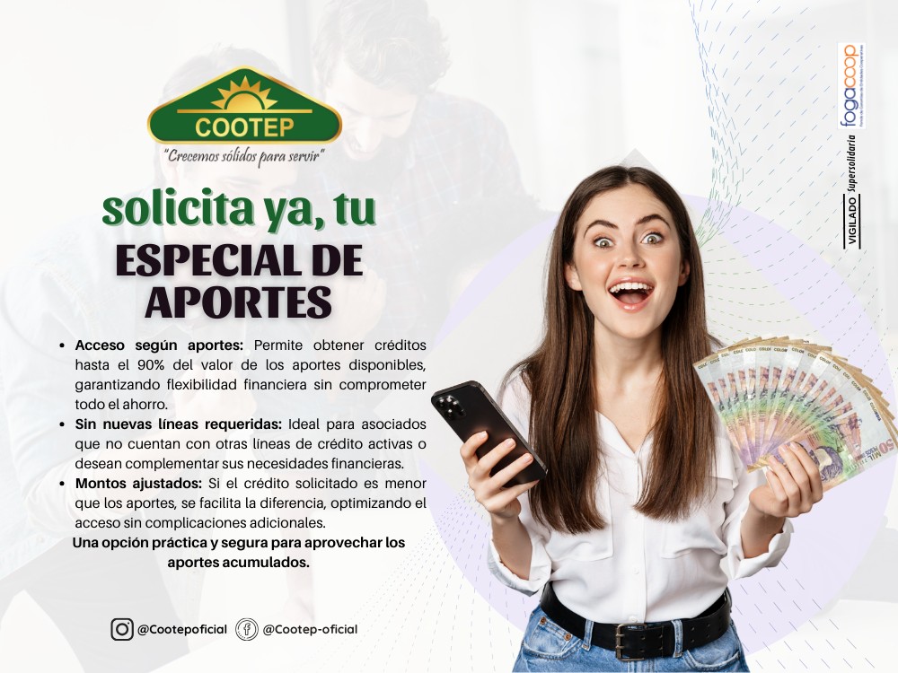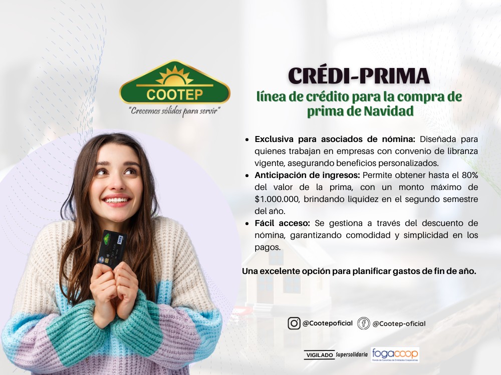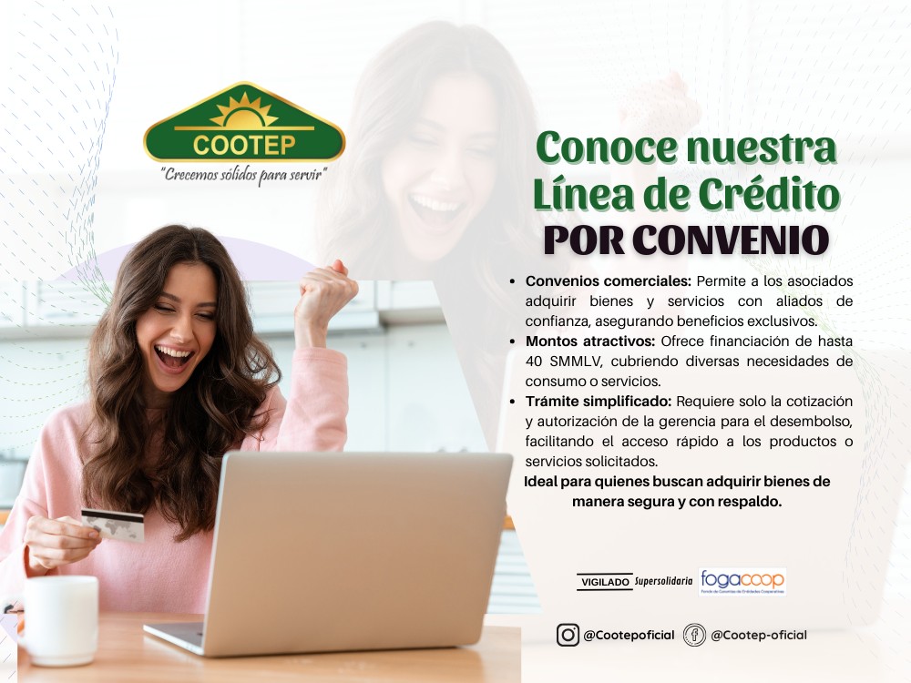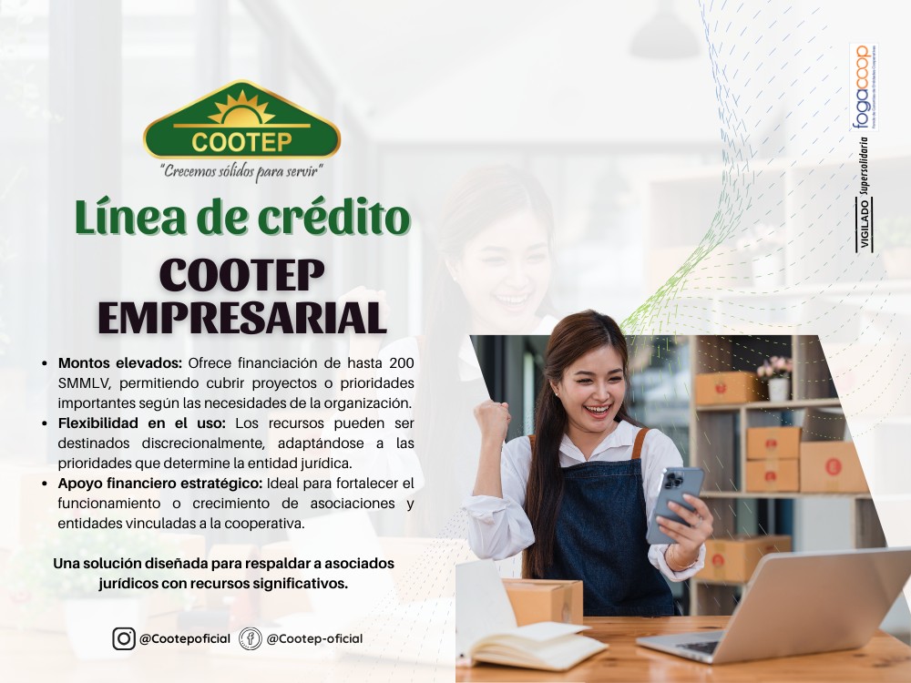 Ofrecemos una amplia gama de líneas de crédito pensadas para cubrir las diferentes necesidades de sus asociados, ya sea para educación, imprevistos, salud o libre inversión. Los créditos se caracterizan por sus tasas competitivas, plazos flexibles y una atención personalizada, enfocada en facilitar el acceso al financiamiento. Cada modalidad está diseñada con beneficios específicos para apoyar el bienestar y desarrollo económico de los miembros de la cooperativa, promoviendo una cultura de ahorro y responsabilidad financiera.
